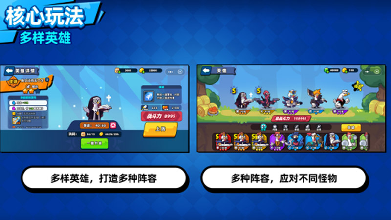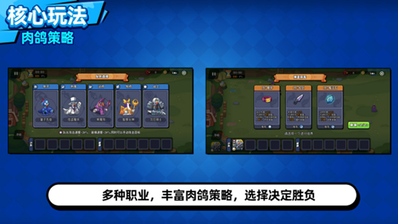 游戏采用2D卡通画风,玩家指挥五只职业各异的小鸡英雄(战士、刺客、牧师、法师、射手)抵御怪物潮,通过拾取“金羽毛”在单局内随机升级技能与装备,体验“割草”式清屏爽感。局外则设有轻量卡牌系统:抽卡、突破、一键升级,离线也能领取巡逻收益,兼顾休闲与养成深度。